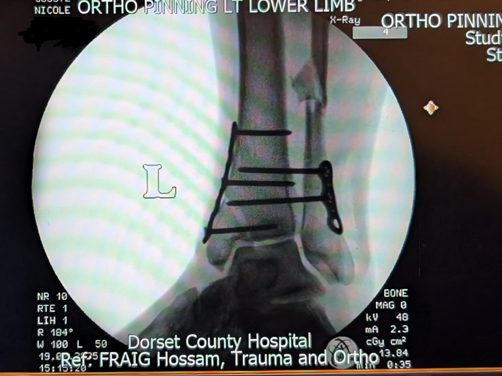 In February 2025, while schooling a young horse, Nicole took a seemingly minor fall and landed on her feet – only to hear the sickening sound of breaking bone. X-rays later confirmed a Weber C ankle fracture involving both tibia and fibula, with significant ligament damage, requiring surgery and months of rehabilitation.